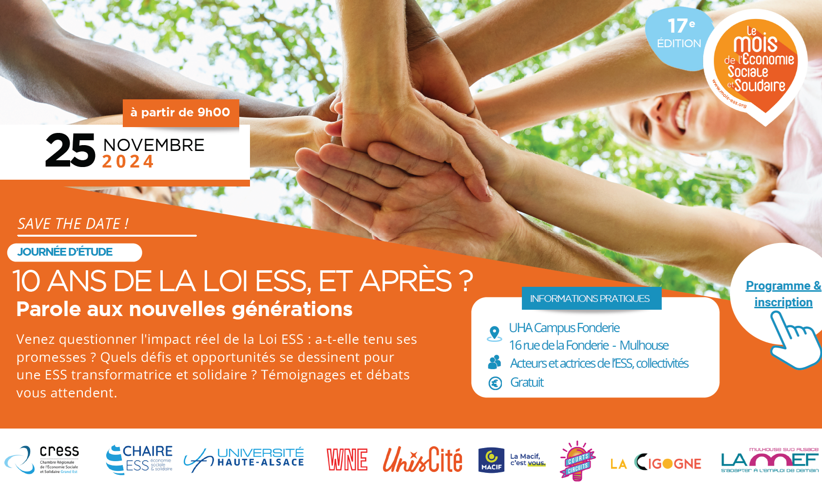 Cette Journée mettra en avant les nouvelles générations d’acteurs et de praticiens, en particulier à travers les témoignages des nouveaux et des anciens étudiants et étudiantes du Master Ingénierie de projets en ESS de l’UHA, qui fêtera ses 20 ans en 2025.